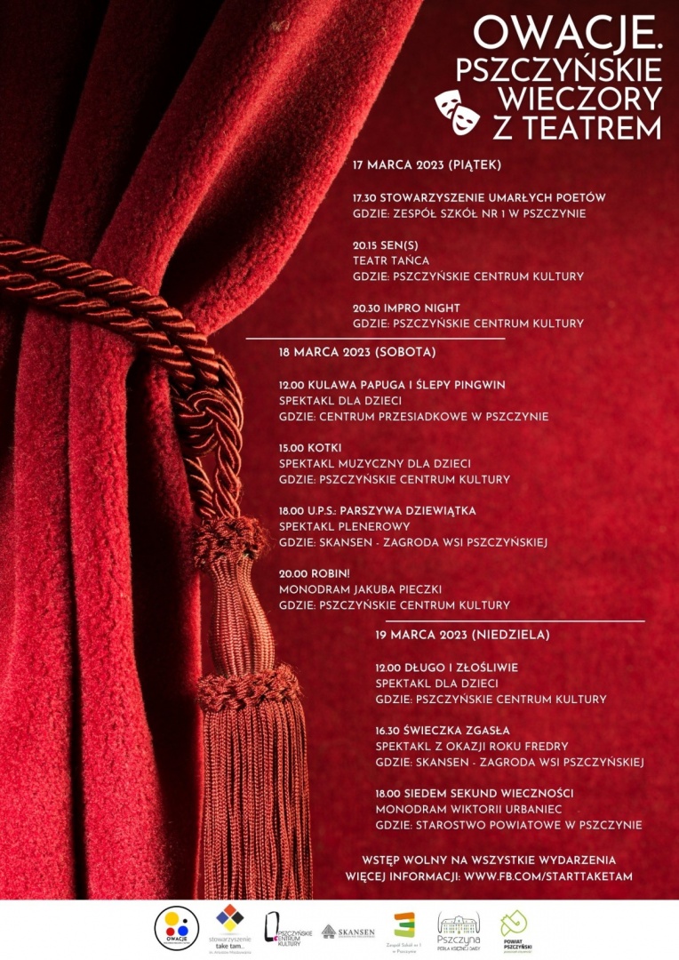 Stowarzyszenie „take tam..” im. Artystów Międzywojnia za dwa tygodnie rusza z tegoroczną edycją OWACJI. Pszczyńskich Wieczorów z Teatrem. Młodzi aktorzy w marcu zagrają 10 spektakli. Wystąpią też w Centrum Przesiadkowym i Starostwie Powiatowym w Pszczynie.