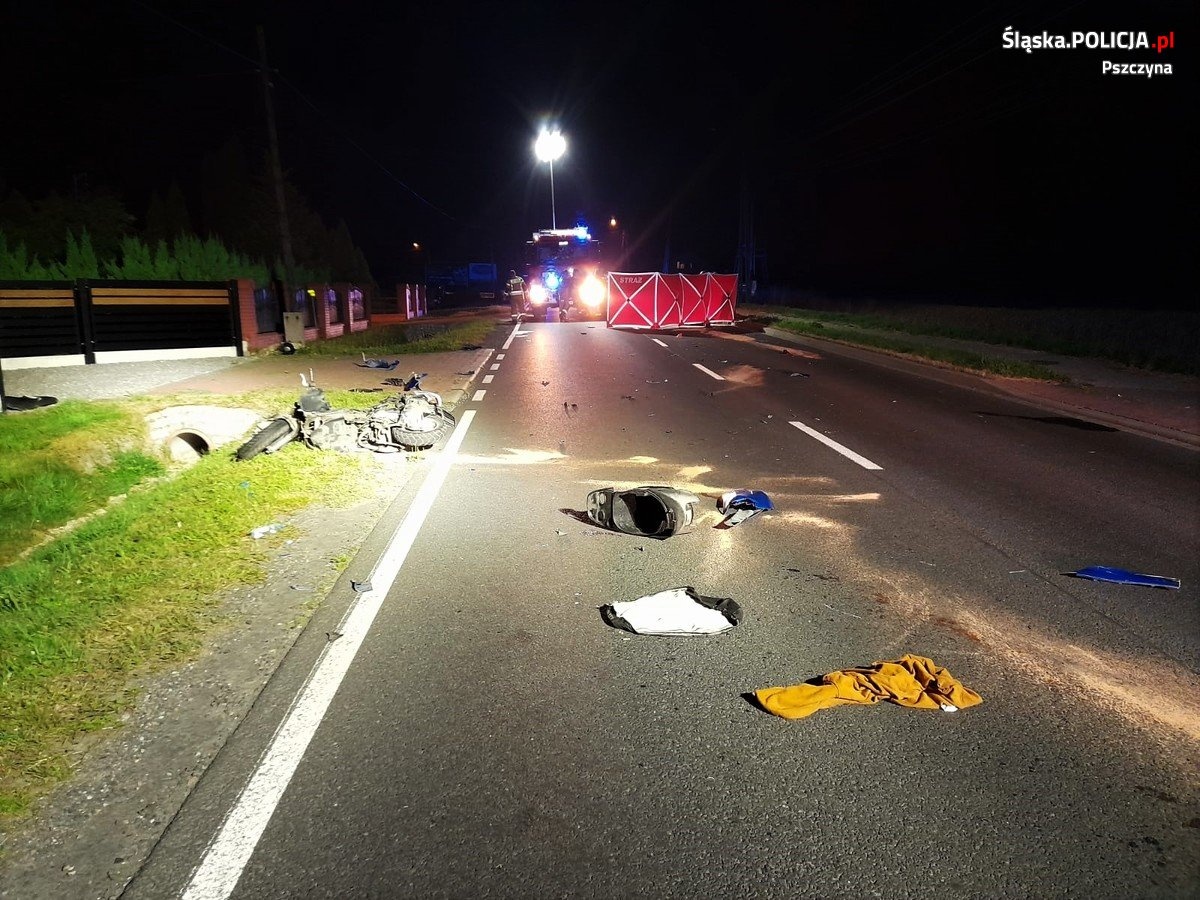 Do wypadku drogowego doszło w sobotę, około 30 minut po północy ulicy Pszczyńskiej w miejscowości Góra. Ze wstępnych ustaleń pracujących na miejscu policjantów wynika, że 26-letni kierujący motocyklem marki Honda, jadąc w kierunku Pszczyny, zderzył się z przechodzącym na drugą stronę jezdni 30-latkiem, który przeprowadzał przez drogę motorower kenzo. W wyniku tego zdarzenia 30-letni mieszkaniec województwa małopolskiego poniósł śmierć na miejscu, a 26-letni mieszkaniec powiatu pszczyńskiego w stanie ciężkim, Lotniczym Pogotowiem Ratunkowym trafił do szpitala w Sosnowcu. Policjanci zabezpieczyli krew do dalszych badań laboratoryjnych. Na miejscu zdarzenia drogowego, pod nadzorem prokuratora, pracowali policjanci z katowickiej drogówki i grupa dochodzeniowo-śledcza z technikiem kryminalistyki.Teraz śledczy będą badać dokładne przyczyny i okoliczności tego wypadku.