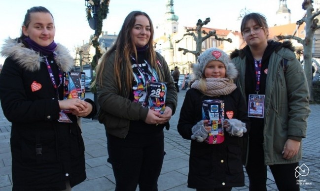 Cztery dziewczyny w różnym wieku. W dłoniach trzymają puszki z Wielkiej Orkiestry Świątecznej Pomocy. W tle pszczyński rynek.W zeszłym roku Powiatowy Sztab WOŚP zebrał 62 tys. zł