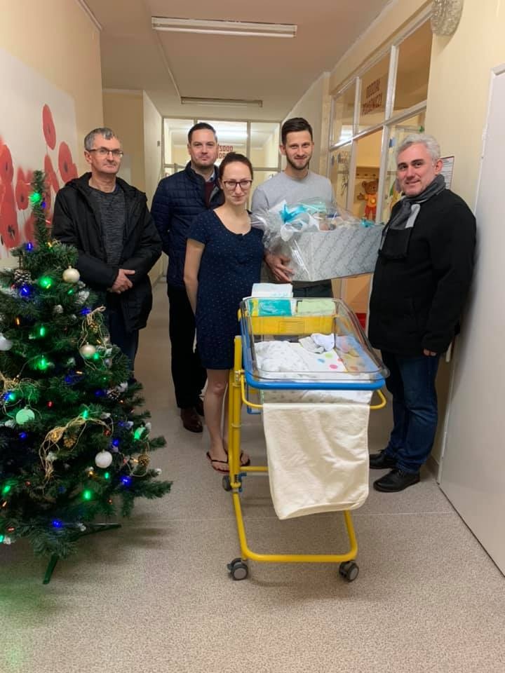 Andrzej Mańka Radny Rady Miejskiej w Pszczynie wspólnie z Radnymi Michał Ziebura i Marek Szklorz przekazali zakupiony upominek, pierwszemu urodzonemu w 2020 roku Mieszkańcowi Gminy.