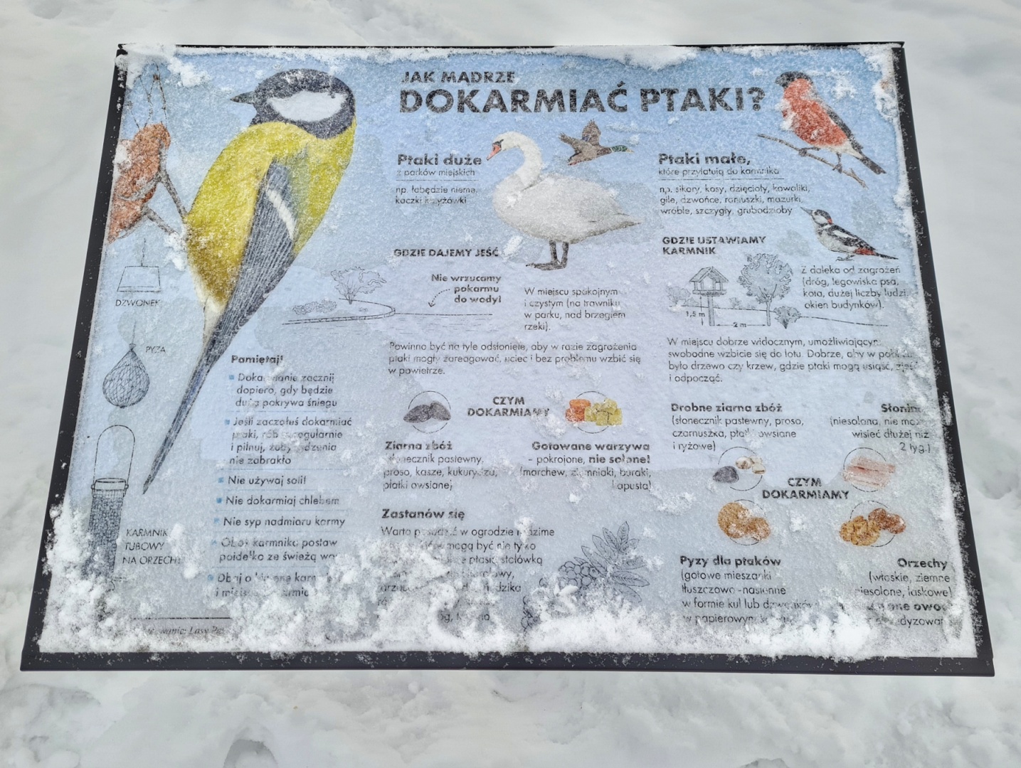O tym, jak mądrze dokarmiać ptaki możecie również dowiedzieć się z tablicy umieszczonej przy głównej alei w Parku Zamkowym. Zachęcamy do zapoznania się z tą krótką informacją podczas spacerów.