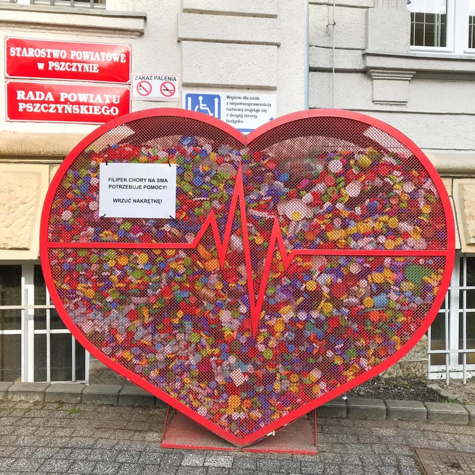 - W sumie przekazaliśmy dzisiaj kilkanaście worków wypełnionych plastikowymi korkami. Dochód z ich sprzedaży zostanie przeznaczony na leczenie Filipka Cholewy, który cierpi na rdzeniowy zanik mięśni SMA. Serce ustawiliśmy przed Starostwem Powiatowym w Pszczynie początkiem października ubiegłego roku. Początkowo dochód z zebranych nakrętek zasilał zbiórkę na leczenie Maciusia Cieślika - informuje Starostwo Powiatowe w Pszczynie