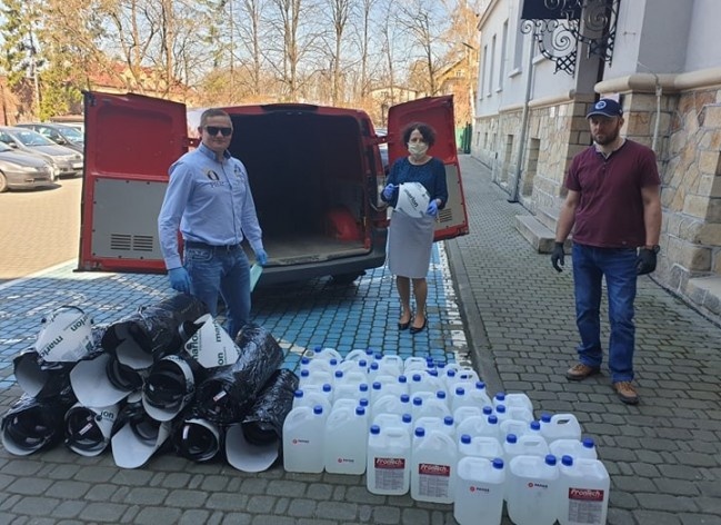 250 litrów płynu dezynfekcyjnego oraz 110 przyłbic to środki przekazane pszczyńskiemu starostwu przez firmę Pamar Marcela Szczotki z Pszczyny, który dzięki pomocy Jacka Kubisa obdarował także m.in. izolatorium w Goczałkowicach oraz szpital zakaźny w Tychach.