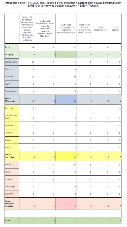 Aktualności i najnowsze komunikaty GIS dotyczące koronawirusa SARS-CoV-2 Informacja z dnia 14.04.2020 roku, godzina 14:00 związana z zagrożeniem nowym koronawirusem SARS-CoV-2 w rejonie objętym nadzorem PSSE w Tychach.