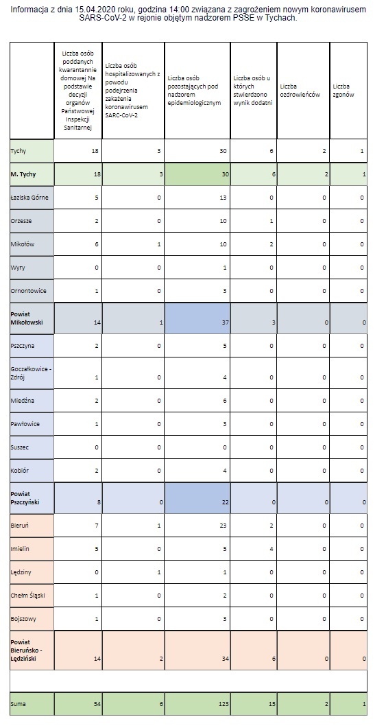 Aktualności i najnowsze komunikaty GIS dotyczące koronawirusa SARS-CoV-2 Informacja z dnia 15.04.2020 roku, godzina 14:00 związana z zagrożeniem nowym koronawirusem SARS-CoV-2 w rejonie objętym nadzorem PSSE w Tychach.