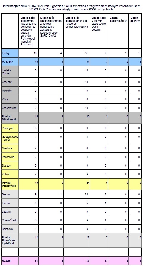 Aktualności i najnowsze komunikaty GIS dotyczące koronawirusa SARS-CoV-2 Informacja z dnia 16.04.2020 roku, godzina 14:00 związana z zagrożeniem nowym koronawirusem SARS-CoV-2 w rejonie objętym nadzorem PSSE w Tychach.