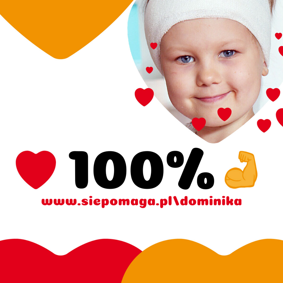 Dla nas 100% to dopiero początek! To minimum, które daje nadzieję. Ale każdy z nas daje z siebie dla Ciebie 200% i to jest jedyny cel, jaki możemy sobie postawić! Dalej, ciągle i niezmiennie ROBIMY HAŁAS DLA DOMINIKI! 15 grudnia zapraszamy na koncert do Miejsko-Gminny Ośrodek Kultury w Strumieniu (MGOK). To będzie wielkie święto dla wszystkich, którzy trzymają kciuki za Dominikę i przyczynili się do wspaniałego wyniku zbiórki! Nie zatrzymujemy się! Wręcz przeciwnie, zrobimy wszystko i jeszcze więcej, żeby Dominika wróciła do zdrowia! Dziękujemy wszystkim Ludziom wielkiego serca i liczymy na więcej! - czytamy na fb Uratujmy Dominikę