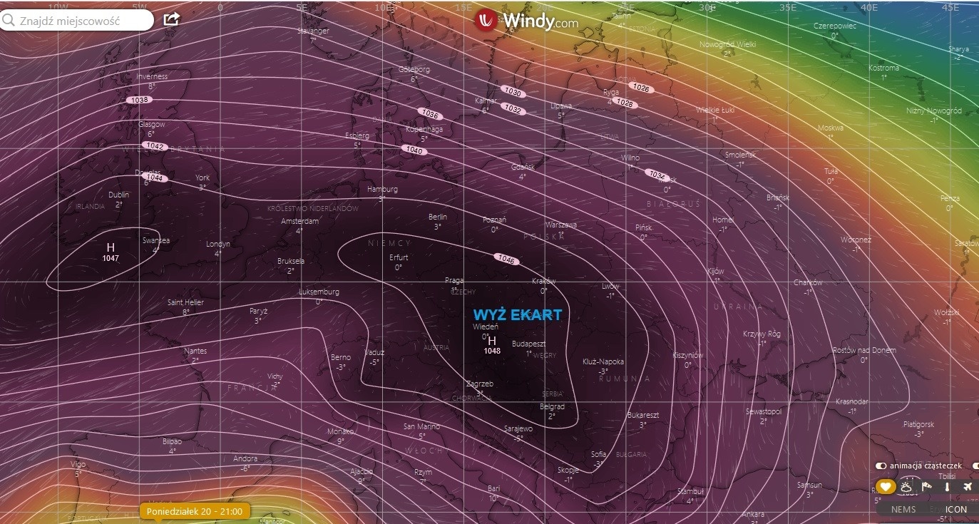 - Po weekendowych opadach już praktycznie nie ma śladu, jedynie wysoko w górach śnieg się utrzymał. Teraz w miejsce zatoki niskiego ciśnienia wchodzi potężny wyż Ekart, który w poniedziałek i wtorek przyniesie ciśnienie atmosferyczne na poziomie 1044-1046hPa! Niestety mimo wysokiego ciśnienia nie będzie pięknej pogody. W poniedziałek zachmurzenie duże/całkowite, lokalnie możliwe jeszcze symboliczne opady śniegu. Temperatura koło 0*C. Będzie mgliście i ze smogiem - informuje FB Łowcy Burz Podbeskidzie