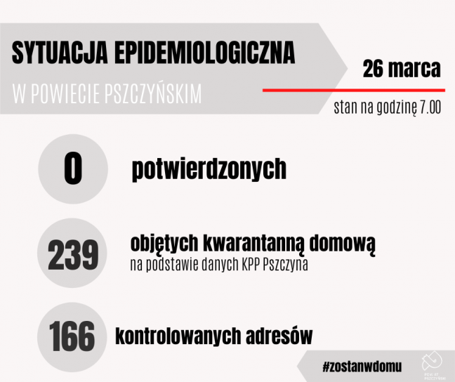 Powiat Pszczyńskim podaje jak wygląda sytuacja epidemiologiczna w naszym Powiecie na godz. 7:00. 26.03.2020r.
