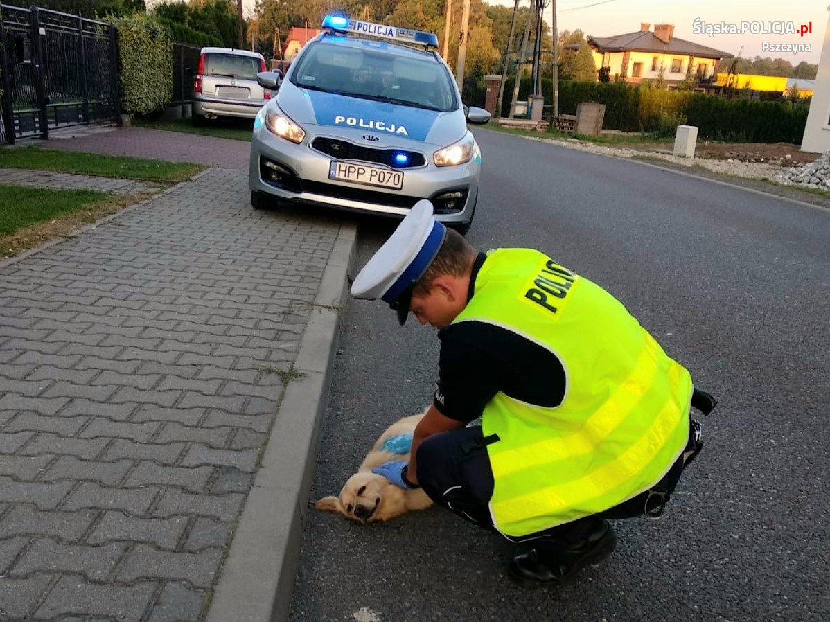 Pszczyńscy policjanci pomogli psu potrąconemu przez samochód i zaopiekowali się nim do czasu przyjazdu wezwanego przez weterynarza