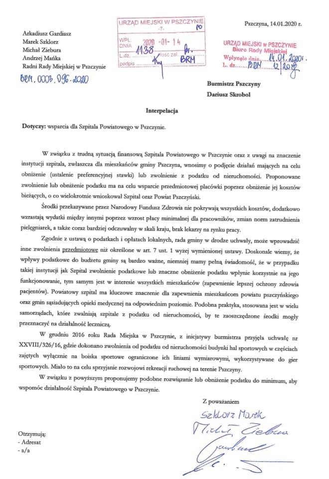 - Wspólnie z radnymi Arkadiusz Gardiasz - radny Rady Miejskiej w Pszczynie, Michał Ziebura i Marek Szklorz złożyliśmy interpelację dotyczącą pomocy dla pszczyńskiego szpitala - informuje Andrzej Mańka Radny Rady Miejskiej w Pszczynie.