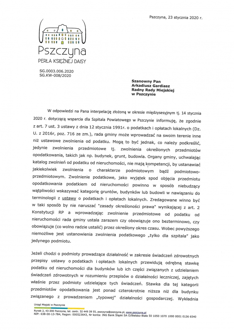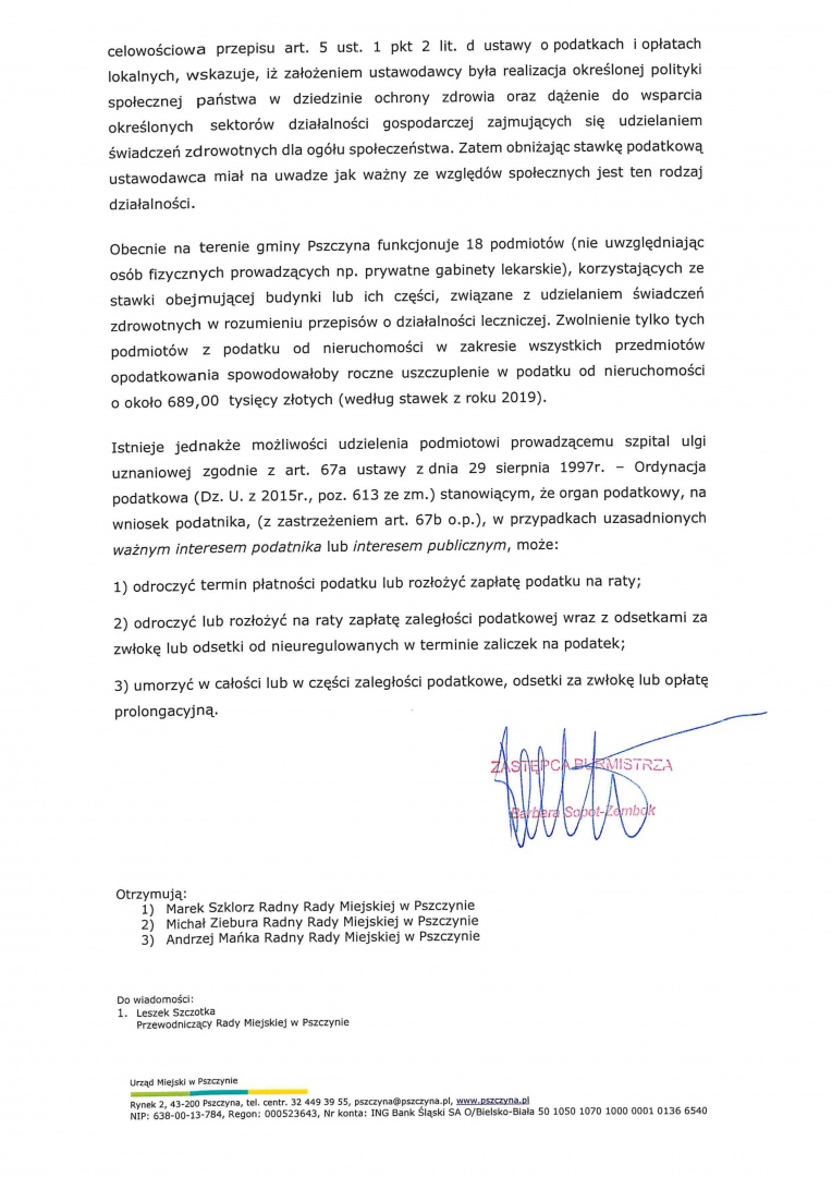 W związku z trudną sytuacją finansową Szpitala Powiatowego w Pszczynie oraz z uwagi na znaczenie instytucji szpitala, zwłaszcza dla mieszkańców gminy Pszczyna, 14 stycznia br. kilku radnych wniosło o podjęcie działań mających na celu obniżenie (ustalenie preferencyjnej stawki) lub zwolnienie z podatku od nieruchomości. Proponowane zwolnienie ma na celu wsparcie przedmiotowej placówki poprzez obniżenie jej kosztów bieżących, o co wielokrotnie wnioskował Szpital oraz Powiat Pszczyński