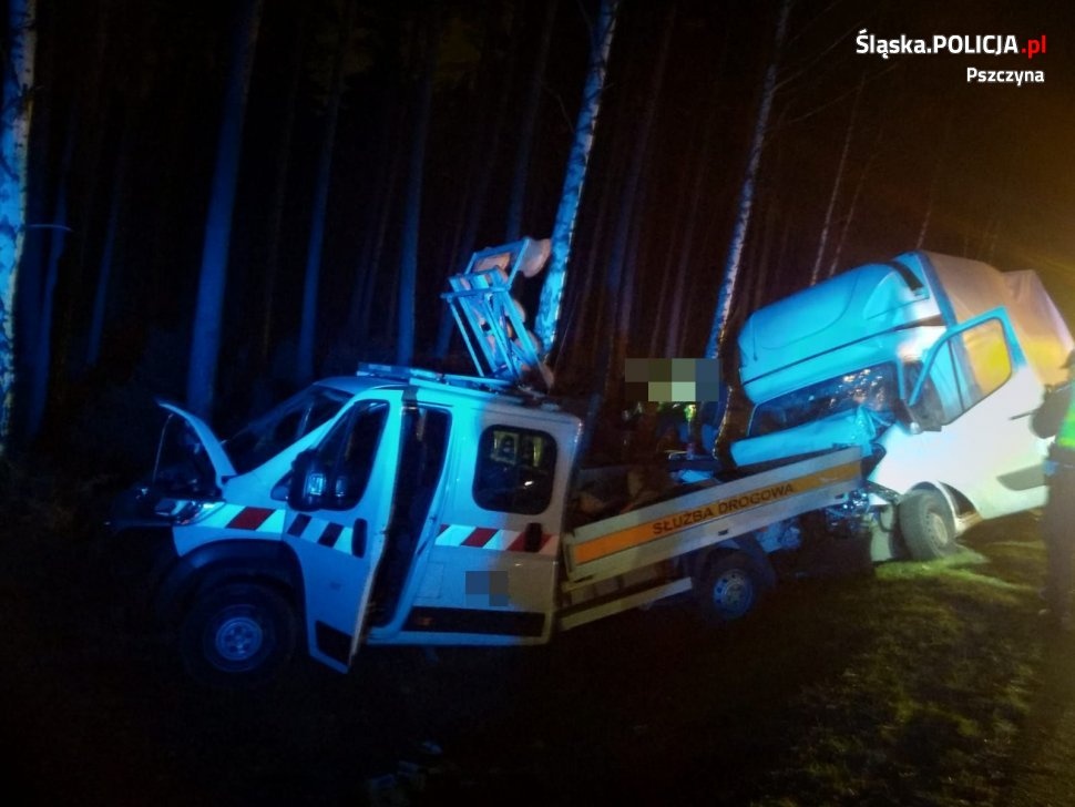 Wczoraj kilka minut po 22 policjanci otrzymali zgłoszenie o zdarzeniu drogowym, do którego doszło w Kobiórze na trasie DK1. Według wstępnych ustaleń policjantów, kierujący samochodem renault master, jadąc w kierunku Pszczyny, najechał na tył pojazdu służby drogowej – fiata ducato, której pracownicy przygotowywali się do prac porządkowych. W wyniku zderzenia, oba samochody znalazły się w przydrożnym rowie.