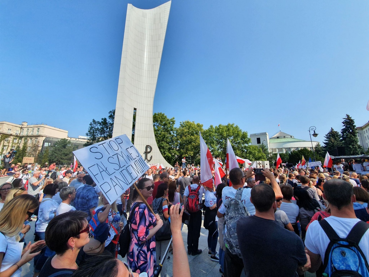 Zanim manifestanci wyruszyli z Wiejskiej, przemawiał m.in. kandydat na prezydenta w ostatnich wyborach, a także lider Strajku Przedsiębiorców Paweł Tanajno. Apelował on do uczestników, aby ludzie nie pozwolili się dzielić. "Ja wiem, że wiele osób czuje się pokrzywdzonych, bo w sklepach pani sprzedawczyni kazała założyć maskę. Nie mówię o marketach, mówię o małych sklepach. Nie bądźmy na nich źli. Oni są na pierwszej linii ognia, to oni dostają wielotysięczne kary" - mówił.Z kolei poseł Konfederacji Grzegorz Braun mówił o tym, że na najbliższym posiedzeniu Sejmu, które odbędzie się 16-17 września, posłowie zajmą się projektem ustawy zawierającej przepis dotyczący odpowiedzialności za działania w czasie epidemii. Nazwał go ustawą "Bezkarność plus". "Jeżeli ta ustawa przejdzie, to władza może wszystko. Nie miejcie państwo złudzeń, nie miejcie wątpliwości, to jest moment przełomowy" - stwierdził.