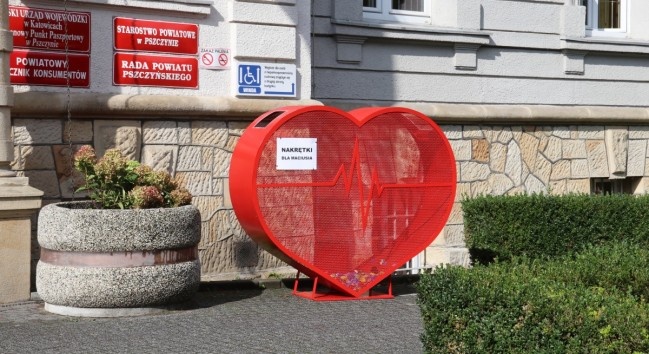 Przed budynkiem Starostwa Powiatowego w Pszczynie stanęło serce, do którego można wrzucać plastikowe nakrętki