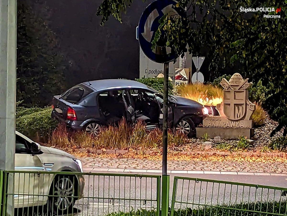 Do niecodziennego zdarzenia doszło na jednym ze skrzyżowań w centrum Pszczyny. Kierujący samochodem marki Opel dosłownie wskoczył na wysepkę ronda, po czym wysiadł z pojazdu i chciał uciec